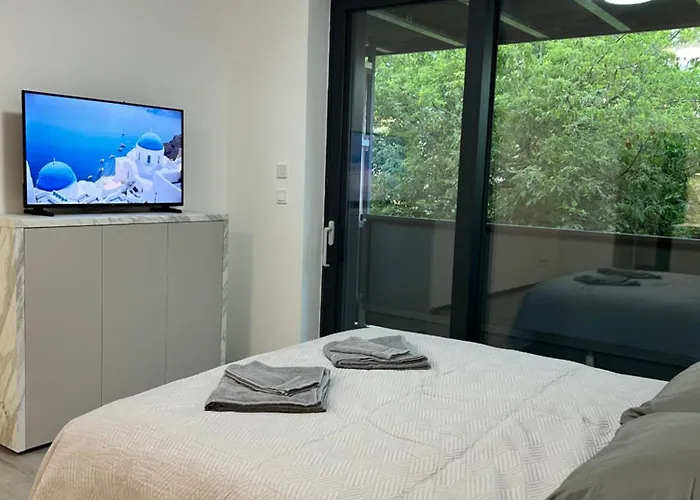 Die Ferienwohnung Ar Santorini White verfügt über einen Balkon und eine Sitzecke und bietet einen Blick auf den Garten. Diese Unterkunft bietet den Gästen einen Haartrockner und Handtücher im Badezimmer. Außerdem gibt es eine begehbare Dusche und eine getrennte Toilette usw.